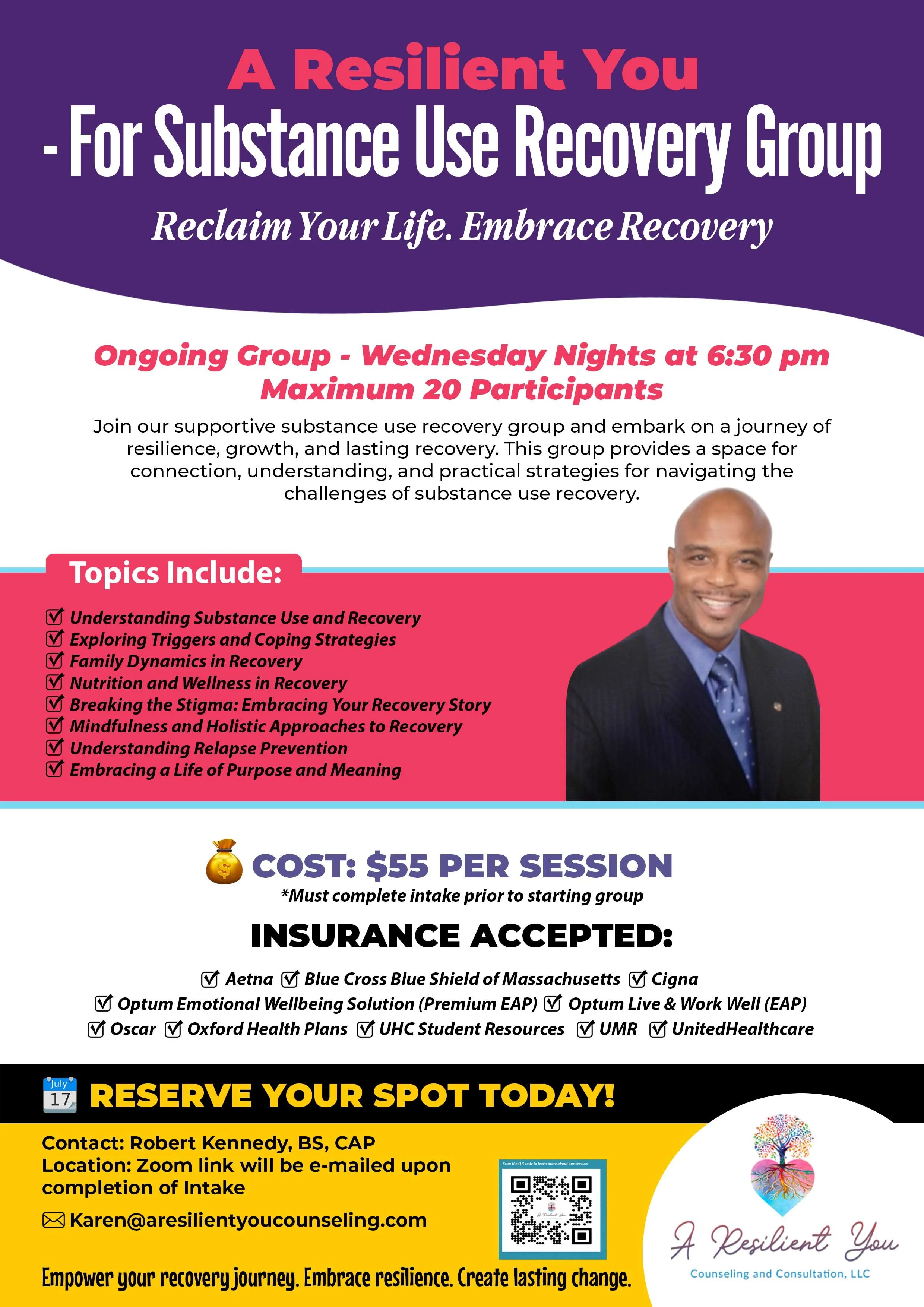 Are you seeking support and guidance on your path to substance use recovery? A Resilient You is an ongoing support group designed to provide a safe and supportive space for individuals to connect, share experiences, and develop practical strategies for navigating the challenges of recovery.