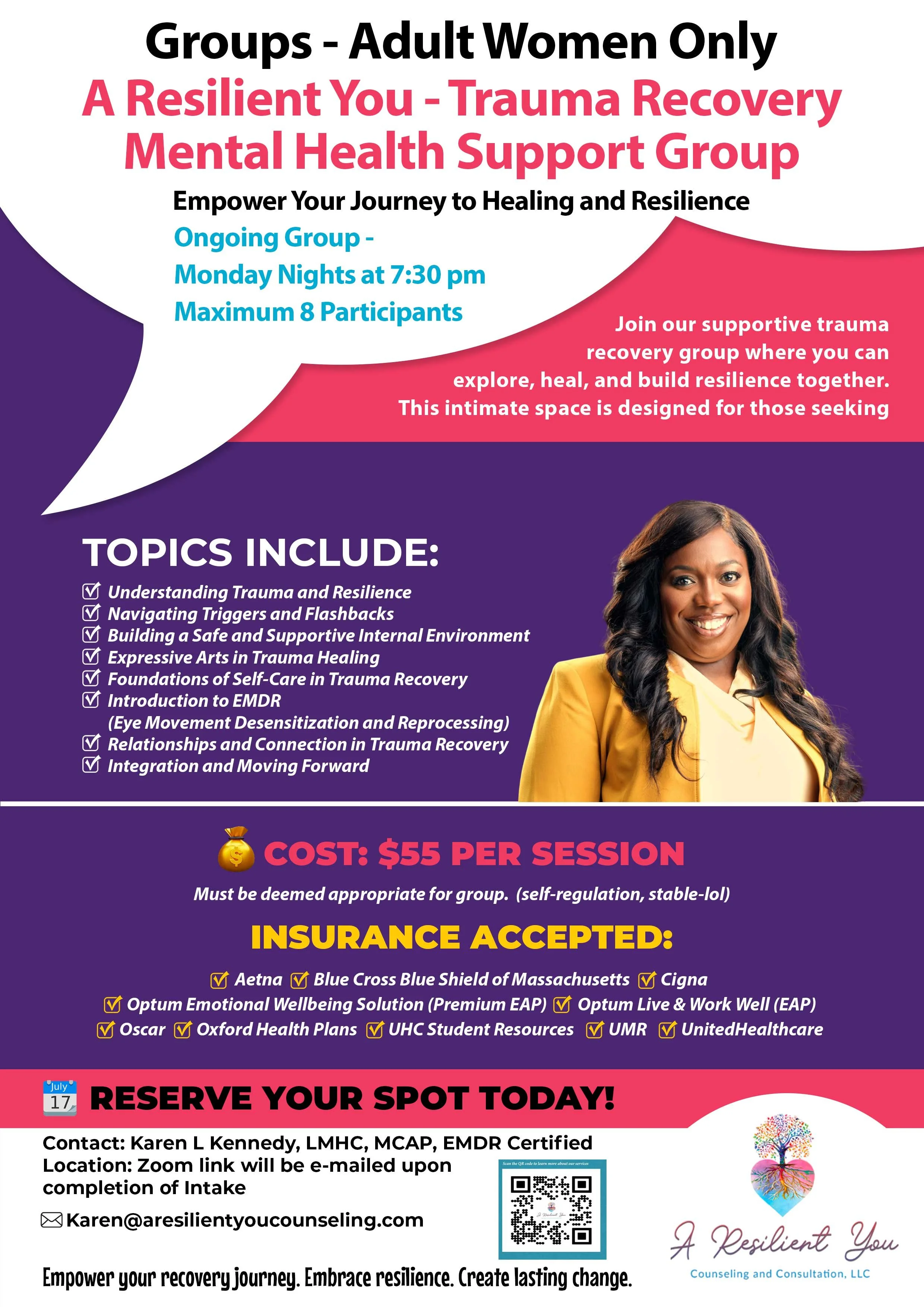 Ready to take charge of your mental well-being? Contact Karen today at Karen@aresilientyoucounseling.com to learn more and reserve your spot.