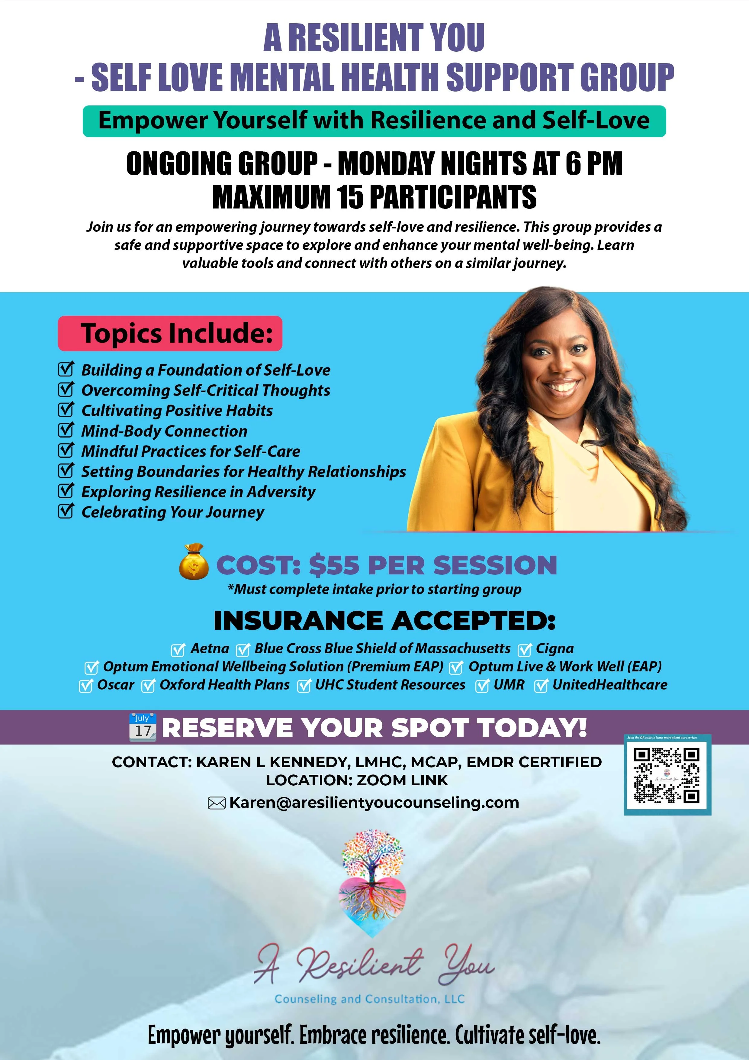 Are you looking to improve your mental well-being and build lasting resilience? Join A Resilient You, a virtual support group designed to empower you through self-love and effective coping mechanisms.